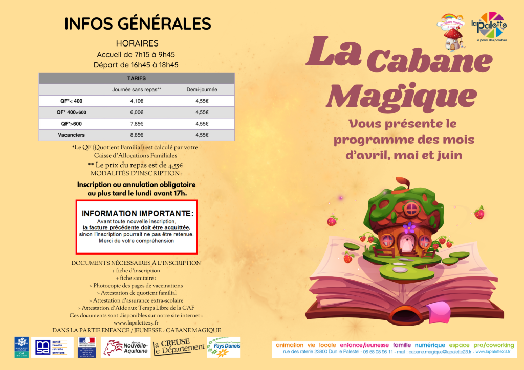 Contacts : 06.58.08.96.11 – cabane.magique@lapalette23.fr